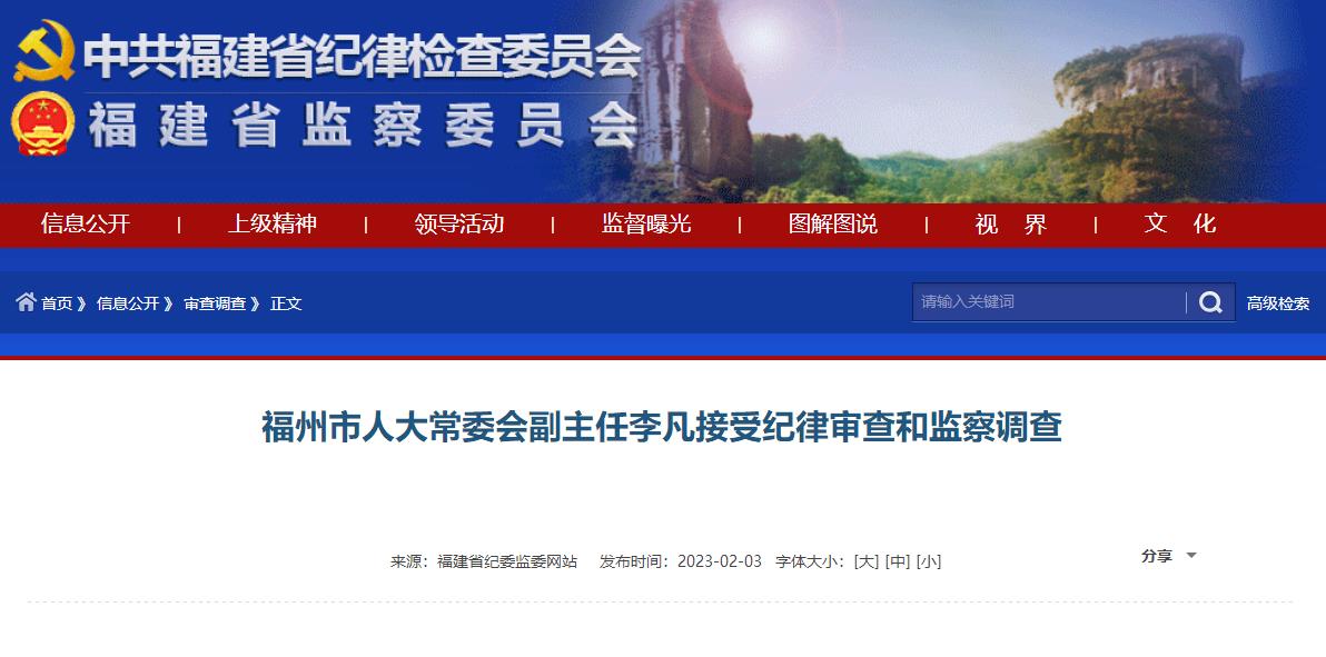 据福建省纪委监委2月3日消息,福州市人大常委会副主任李凡涉嫌严重违纪违法,目前正接受福建省纪委监委纪律审查和监察调查。