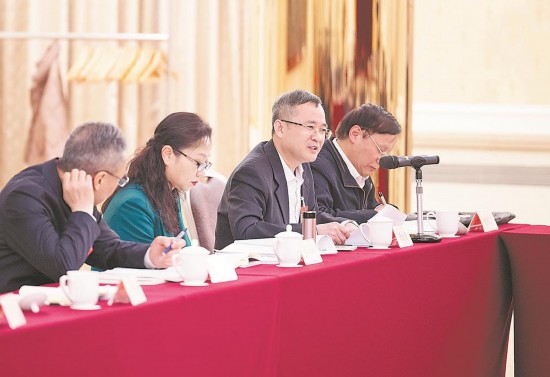 5日下午,出席全国政协十四届二次会议的住闽全国政协委员在各自界别小组,认真审议全国政协常委会工作报告和提案工作情况的报告。图为住闽全国政协委员谢素原(右二)参加科协界别小组讨论。记者 张永定摄
