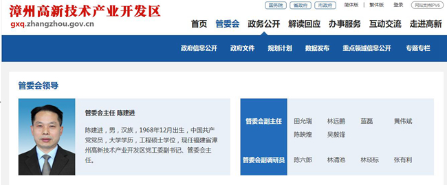 人民网漳州7月11日电 (苏海森)近日,漳州高新技术产业开发区pa真人平台官网更新管委会领导一栏信息,陈建进任漳州高新技术产业开发区党工委副书记、管委会主任。