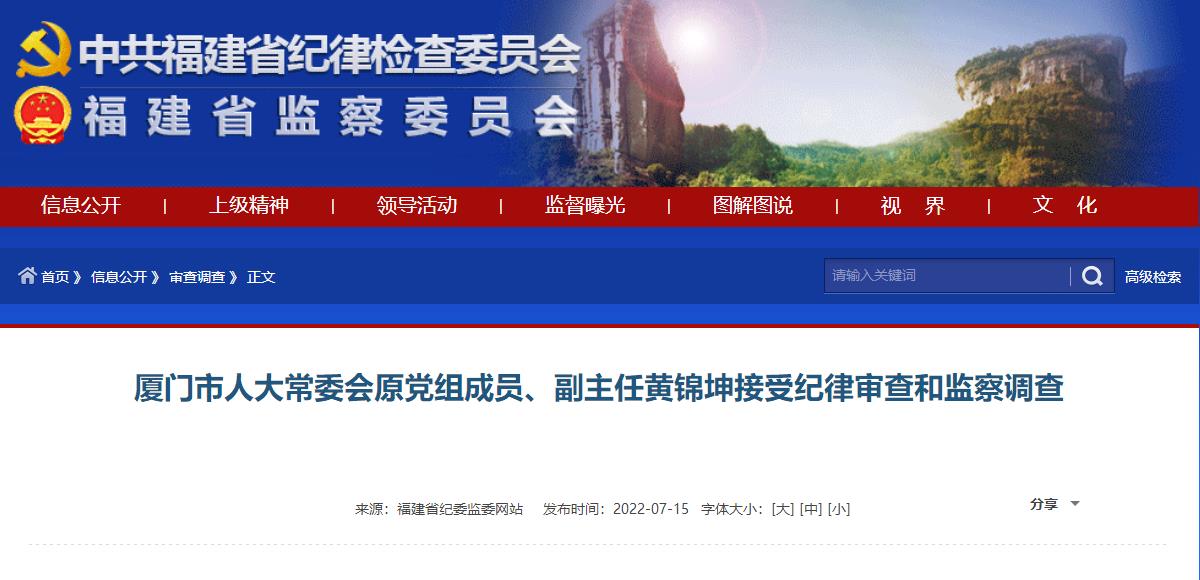 据福建省纪委监委网站消息,厦门市人大常委会原党组成员、副主任黄锦坤涉嫌严重违纪违法,目前正接受福建省纪委监委纪律审查和监察调查。