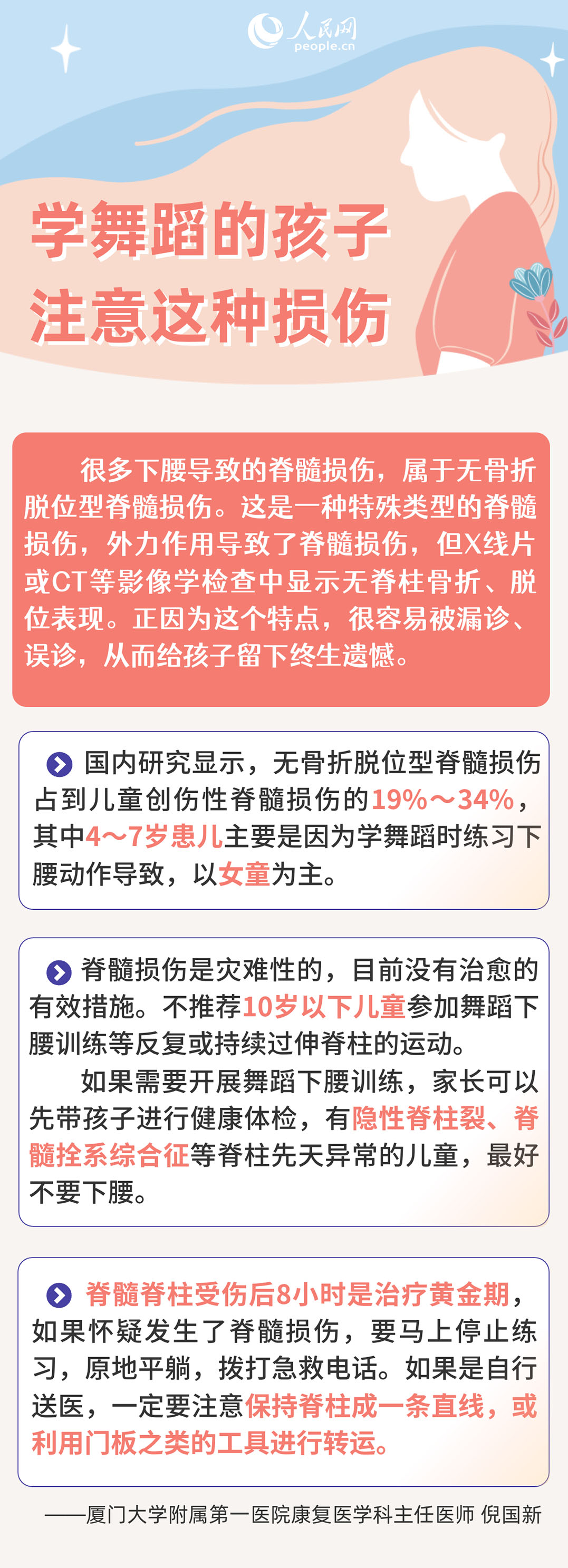 “脊髓损伤是灾难性的,目前没有治愈的有效措施。”倪国新向记者强调,不推荐10岁以下儿童参加舞蹈下腰训练等反复或持续过伸脊柱的运动。