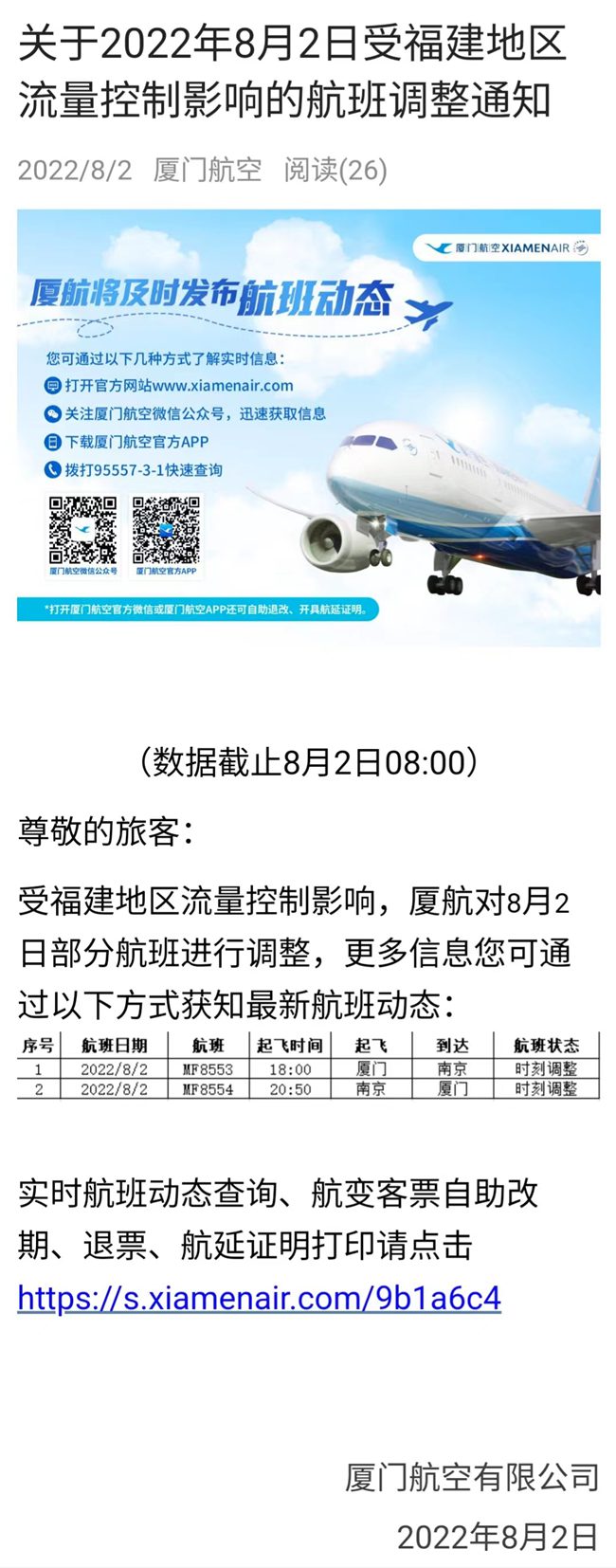 人民网厦门8月2日电 (林盈)据厦门航空有限公司消息,受福建地区流量控制影响,厦航对8月2日部分航班进行调整。厦航有关负责人表示,将以短信形式通知受影响航班旅客。