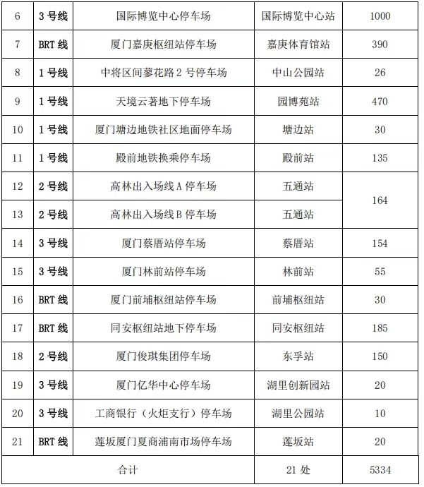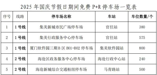 厦门市还布局21个免费p r停车场:本次国庆期间,全市共推出21个停车场、5334个车位,面向地铁换乘车主免费开放,覆盖厦门六区及线网各条线路。 用户可通过“厦门地铁”app、“厦门交通”小程序或“i车位”微信公众号完成一次登记后,即可使用停车换乘服务,国庆期间免费停车。