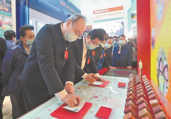 墙上大幅图片是2014年11月习近平总书记来到福州军门社区调研时拍摄的,林丹代表兴奋地与大家分享当时的情景,共同感受习近平总书记浓浓的人民情怀。林占熺代表看到墙上自己当年为闽宁镇村民讲解巨菌草种植知识的照片,露出开心的笑容。项忠红代表望着下党乡美丽风光的图片,十分自豪,连声说要拍下来带回去与乡亲们分享。在“福见百业”互动体验区,大家兴致勃勃地用不同的印章在福建风光特色明信片上拓“福”、造“福”!