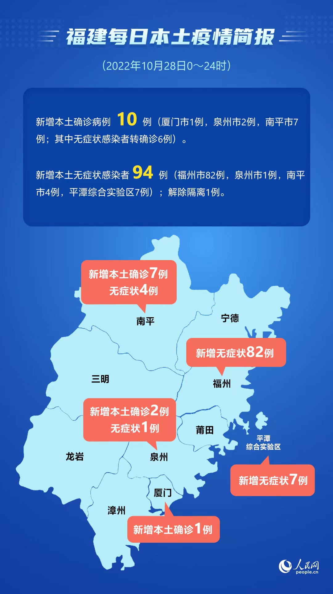人民网福州10月29日电 (江苇杭、焦艳)据福建省卫健委网站消息,10月28日0-24时,福建省报告新增本土确诊病例10例(厦门市1例,泉州市2例,南平市7例;其中无症状感染者转确诊6例)。当日报告新增本土无症状感染者94例(福州市82例,泉州市1例,南平市4例,平潭综合实验区7例);解除隔离1例。福建省本土确诊病例目前住院77例,无死亡病例;现有本土无症状感染者尚在接受集中隔离医学观察473例。