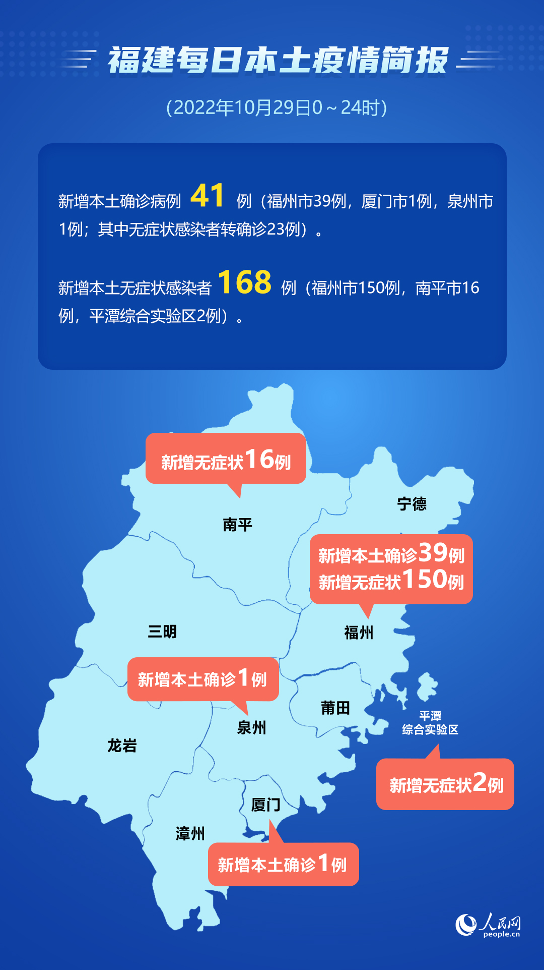 人民网福州10月30日电 (陈楚楚)据福建省卫健委网站消息,10月29日0—24时,福建省报告新增本土确诊病例41例(福州市39例,厦门市1例,泉州市1例;其中无症状感染者转确诊23例)。当日报告新增本土无症状感染者168例(福州市150例,南平市16例,平潭综合实验区2例)。