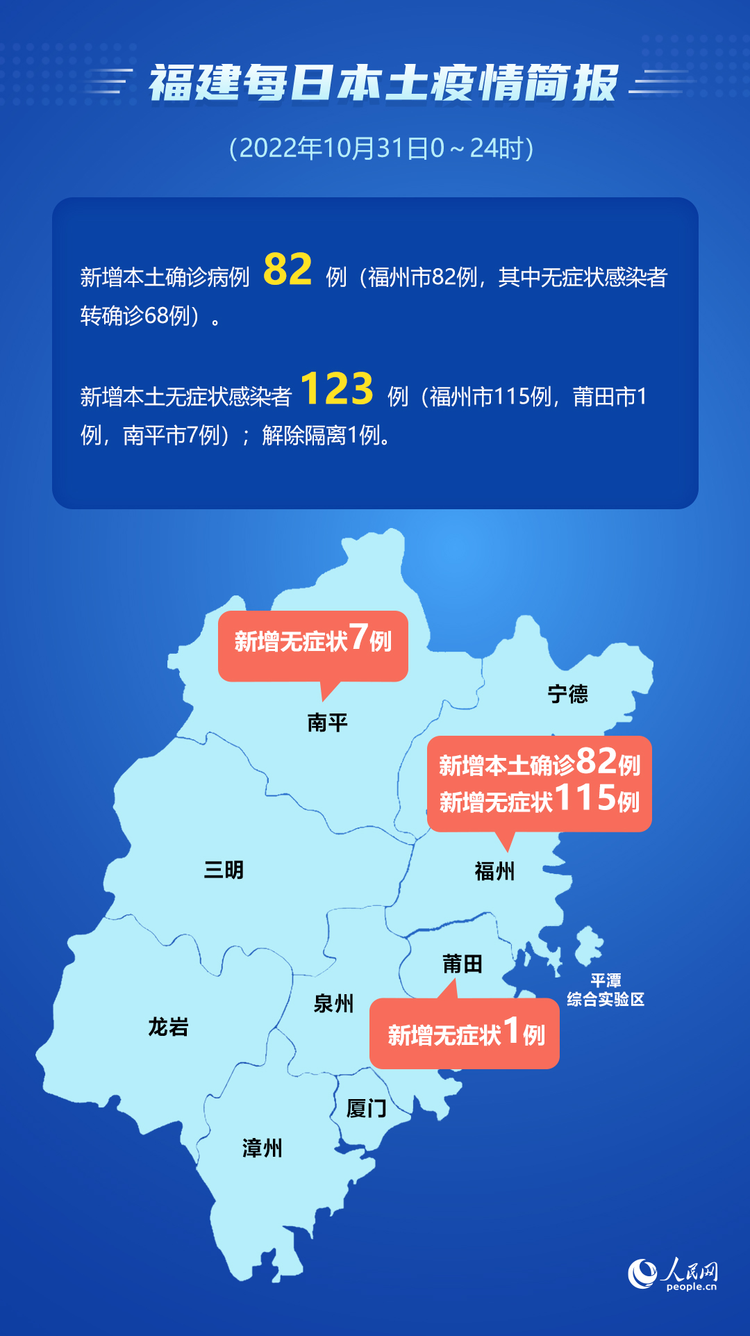 人民网福州11月1日电 (江苇杭、陈永整)据福建省卫健委网站消息,10月31日0-24时,福建省报告新增本土确诊病例82例(福州市82例,其中无症状感染者转确诊68例)。当日报告新增本土无症状感染者123例(福州市115例,莆田市1例,南平市7例);解除隔离1例。全省本土确诊病例目前住院211例,无死亡病例;现有本土无症状感染者尚在接受集中隔离医学观察834例。