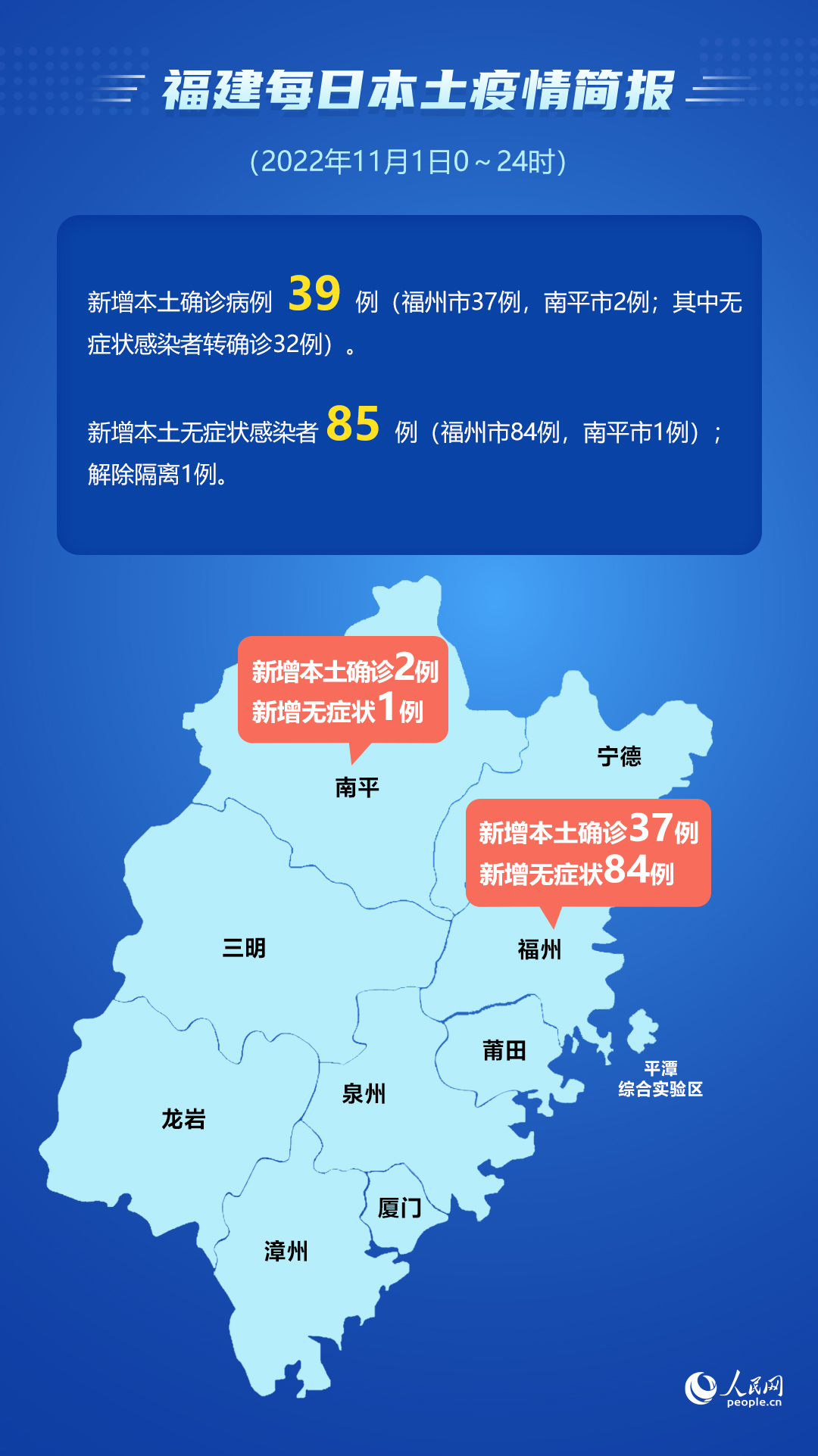 人民网福州11月2日电 (江苇杭、陈永整)据福建省卫健委网站消息,11月1日0-24时,福建省报告新增本土确诊病例39例(福州市37例,南平市2例;其中无症状感染者转确诊32例)。当日报告新增本土无症状感染者85例(福州市84例,南平市1例);解除隔离1例。全省本土确诊病例目前住院248例,无死亡病例;现有本土无症状感染者尚在接受集中隔离医学观察886例。