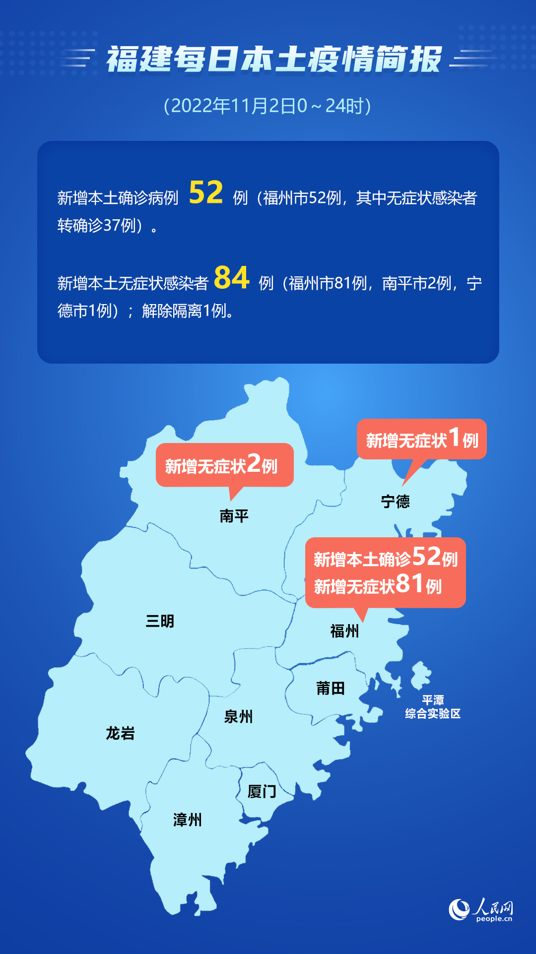 人民网福州11月3日电 (江苇杭、陈永整)据福建省卫健委网站消息,11月2日0-24时,福建省报告新增本土确诊病例52例(福州市52例,其中无症状感染者转确诊37例)。当日报告新增本土无症状感染者84例(福州市81例,南平市2例,宁德市1例);解除隔离1例。全省本土确诊病例目前住院298例,无死亡病例;现有本土无症状感染者尚在接受集中隔离医学观察932例。