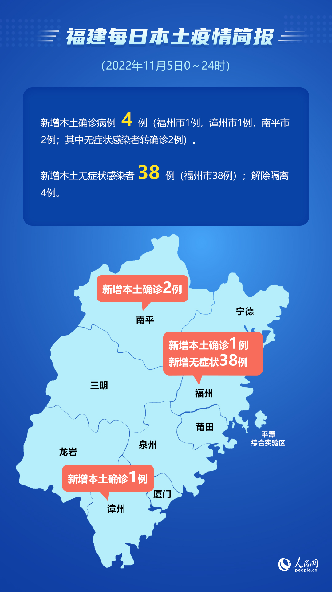 人民网福州11月6日电 (江苇杭、陈永整)据福建省卫健委网站消息,11月5日0-24时,福建省报告新增本土确诊病例4例(福州市1例,漳州市1例,南平市2例;其中无症状感染者转确诊2例)。当日报告新增本土无症状感染者38例(福州市38例);解除隔离4例。全省本土确诊病例目前住院378例,无死亡病例;现有本土无症状感染者尚在接受集中隔离医学观察996例。