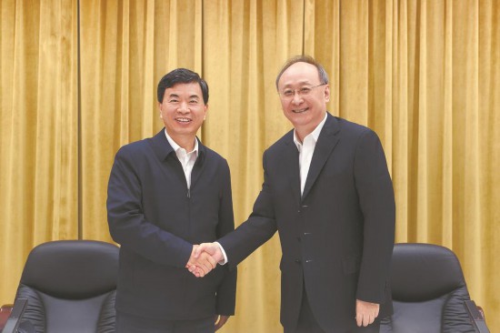 11月13日,尹力同志和周祖翼同志在全省领导干部会议上。记者 肖春道 摄