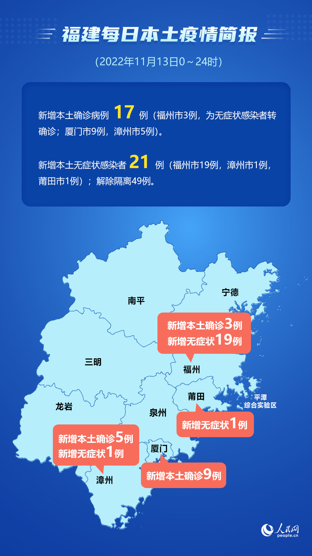 人民网福州11月14日电 (陈楚楚、陈永整)据福建省卫健委网站消息,11月13日0—24时,福建省报告新增本土确诊病例17例(福州市3例,为无症状感染者转确诊;厦门市9例,漳州市5例)。当日报告新增本土无症状感染者21例(福州市19例,漳州市1例,莆田市1例);解除隔离49例。