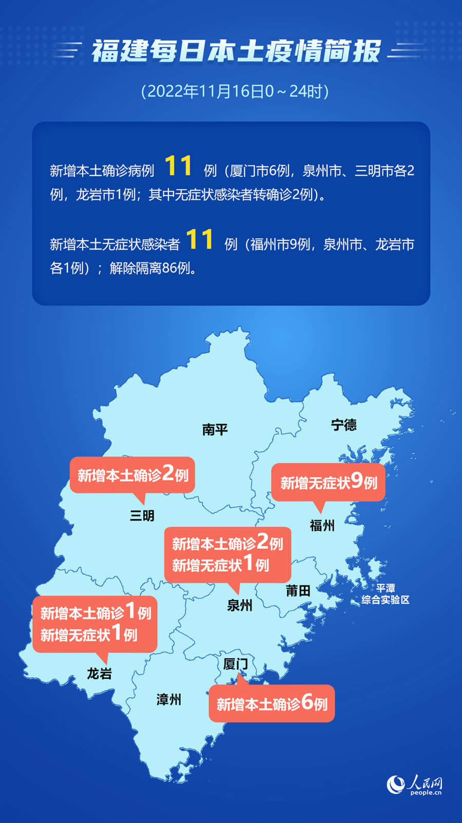 人民网福州11月17日电 (易雪妍、陈永整)据福建省卫健委网站消息,11月16日0—24时,福建省报告新增本土确诊病例11例(厦门市6例,泉州市、三明市各2例,龙岩市1例;其中无症状感染者转确诊2例)。当日报告新增本土无症状感染者11例(福州市9例,泉州市、龙岩市各1例);解除隔离86例。