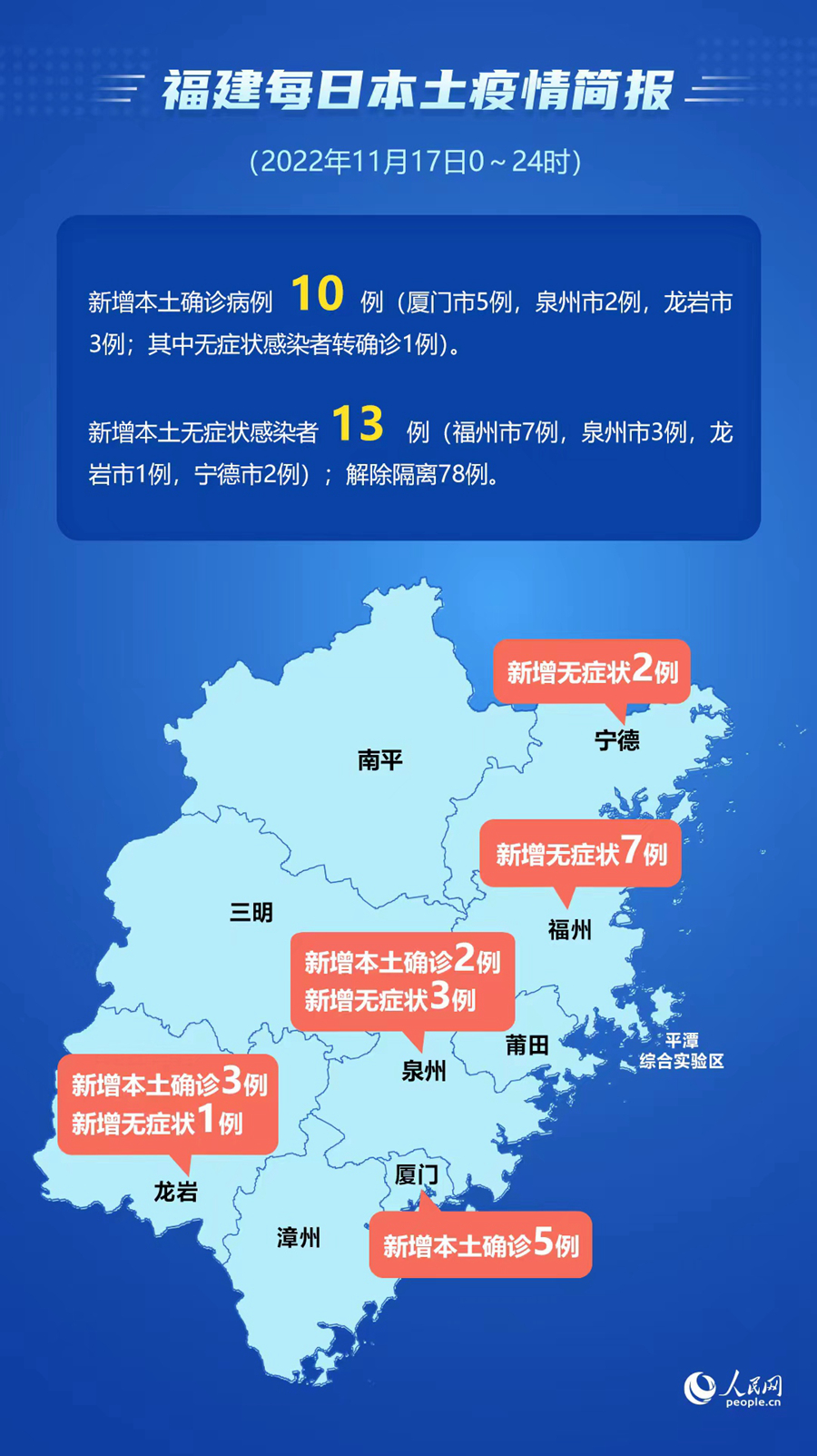 人民网福州11月18日电 (易雪妍、陈永整)据福建省卫健委网站消息,11月17日0—24时,福建省报告新增本土确诊病例10例(厦门市5例,泉州市2例,龙岩市3例;其中无症状感染者转确诊1例)。当日报告新增本土无症状感染者13例(福州市7例,泉州市3例,龙岩市1例,宁德市2例);解除隔离78例。
