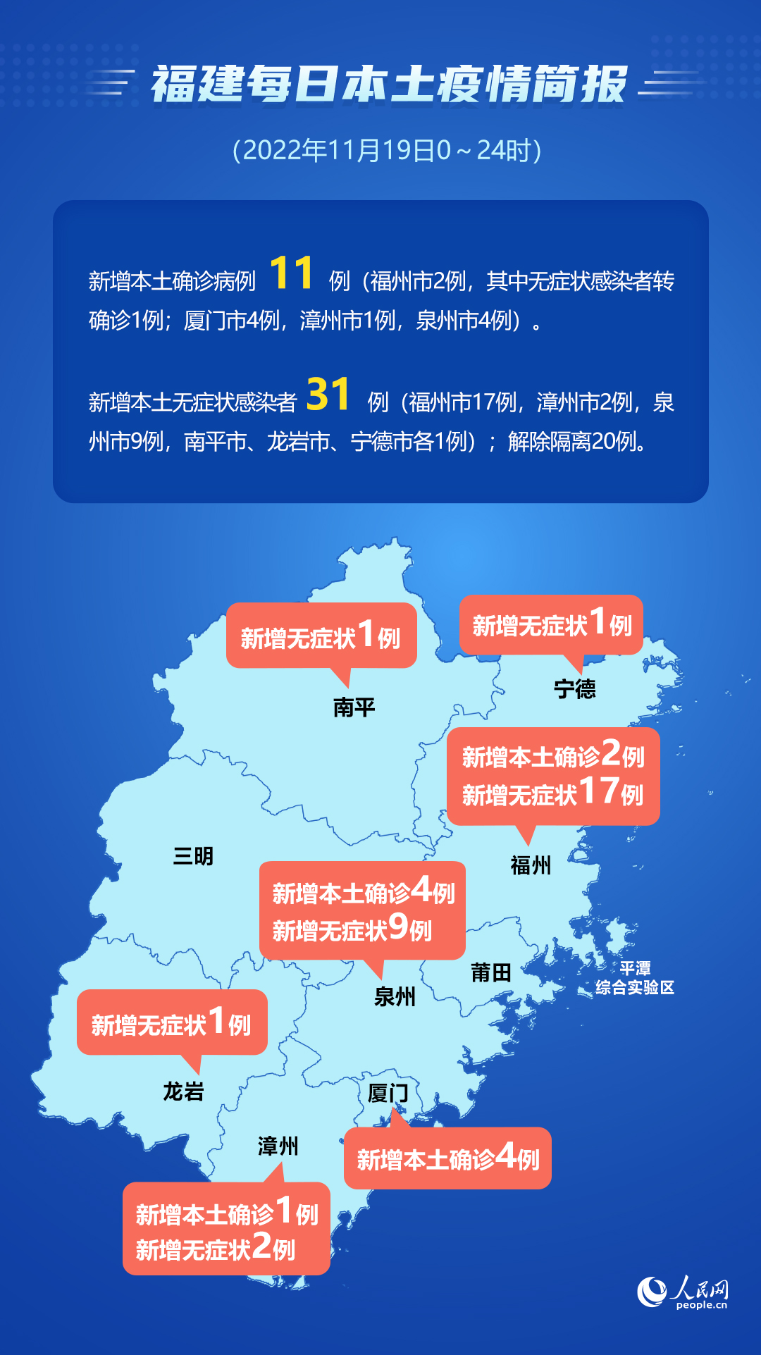 人民网福州11月20日电 (陈楚楚、陈永整)据福建省卫健委网站消息,11月19日0—24时,福建省报告新增本土确诊病例11例(福州市2例,其中无症状感染者转确诊1例;厦门市4例,漳州市1例,泉州市4例)。当日报告新增本土无症状感染者31例(福州市17例,漳州市2例,泉州市9例,南平市、龙岩市、宁德市各1例);解除隔离20例。