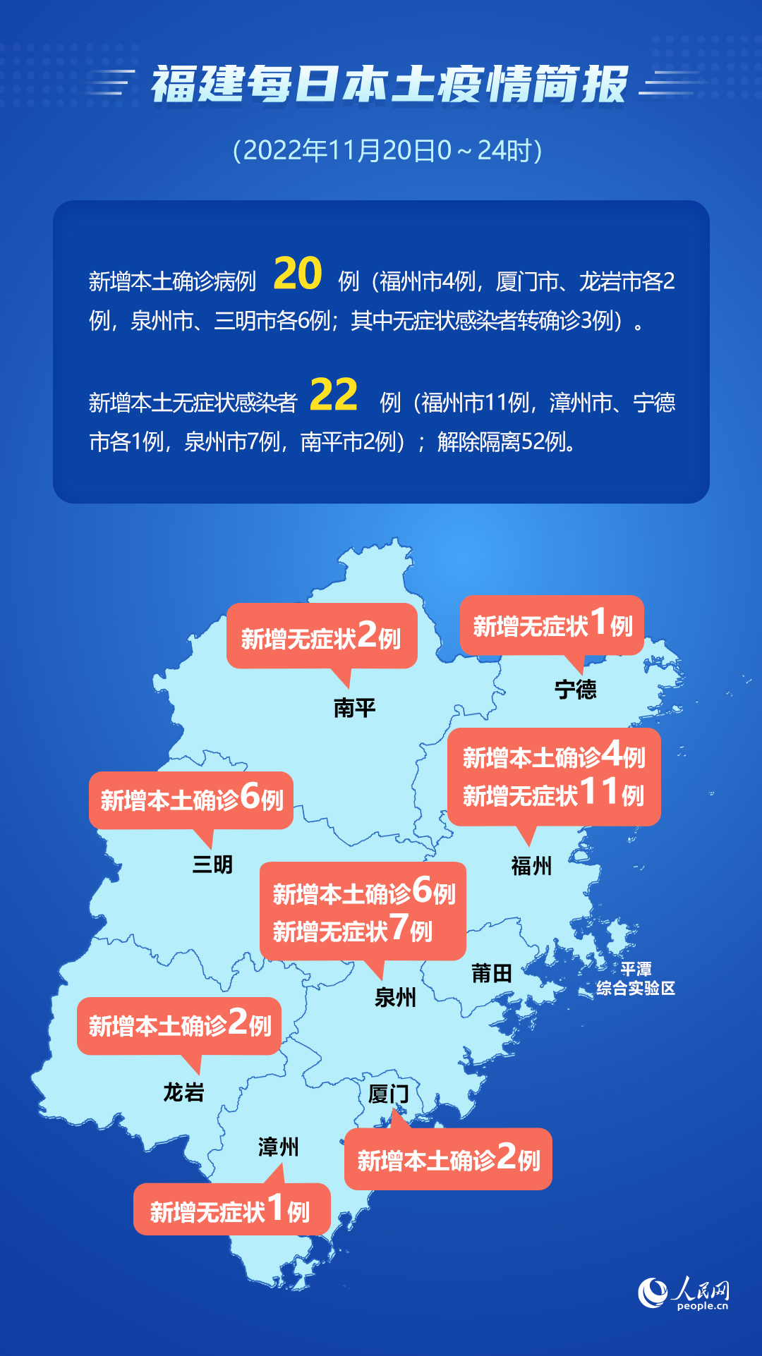 人民网福州11月21日电 (江苇杭、陈永整)据福建省卫健委网站消息,11月20日0-24时,福建省报告新增本土确诊病例20例(福州市4例,厦门市、龙岩市各2例,泉州市、三明市各6例;其中无症状感染者转确诊3例)。当日报告新增本土无症状感染者22例(福州市11例,漳州市、宁德市各1例,泉州市7例,南平市2例);解除隔离52例。全省本土确诊病例目前住院147例,无死亡病例;现有本土无症状感染者尚在接受集中隔离医学观察481例。