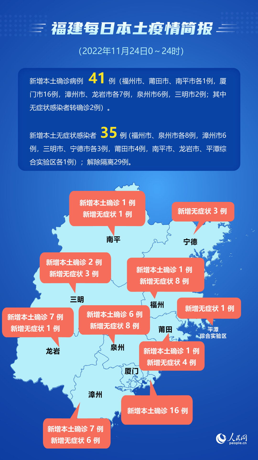 人民网福州11月25日电 (江苇杭、陈永整)据福建省卫健委网站消息,11月24日0-24时,福建省报告新增本土确诊病例41例(福州市、莆田市、南平市各1例,厦门市16例,漳州市、龙岩市各7例,泉州市6例,三明市2例;其中无症状感染者转确诊2例)。当日报告新增本土无症状感染者35例(福州市、泉州市各8例,漳州市6例,三明市、宁德市各3例,莆田市4例,南平市、龙岩市、平潭综合实验区各1例);解除隔离29例。全省本土确诊病例目前住院208例,无死亡病例;现有本土无症状感染者尚在接受集中隔离医学观察377例。