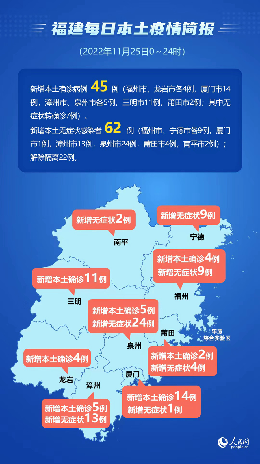 人民网福州11月26日电 (易雪妍、陈永整)据福建省卫健委网站消息,11月25日0~24时,福建省报告新增本土确诊病例45例(福州市、龙岩市各4例,厦门市14例,漳州市、泉州市各5例,三明市11例,莆田市2例;其中无症状转确诊7例)。当日报告新增本土无症状感染者62例(福州市、宁德市各9例,厦门市1例,漳州市13例,泉州市24例,莆田市4例,南平市2例);解除隔离22例。