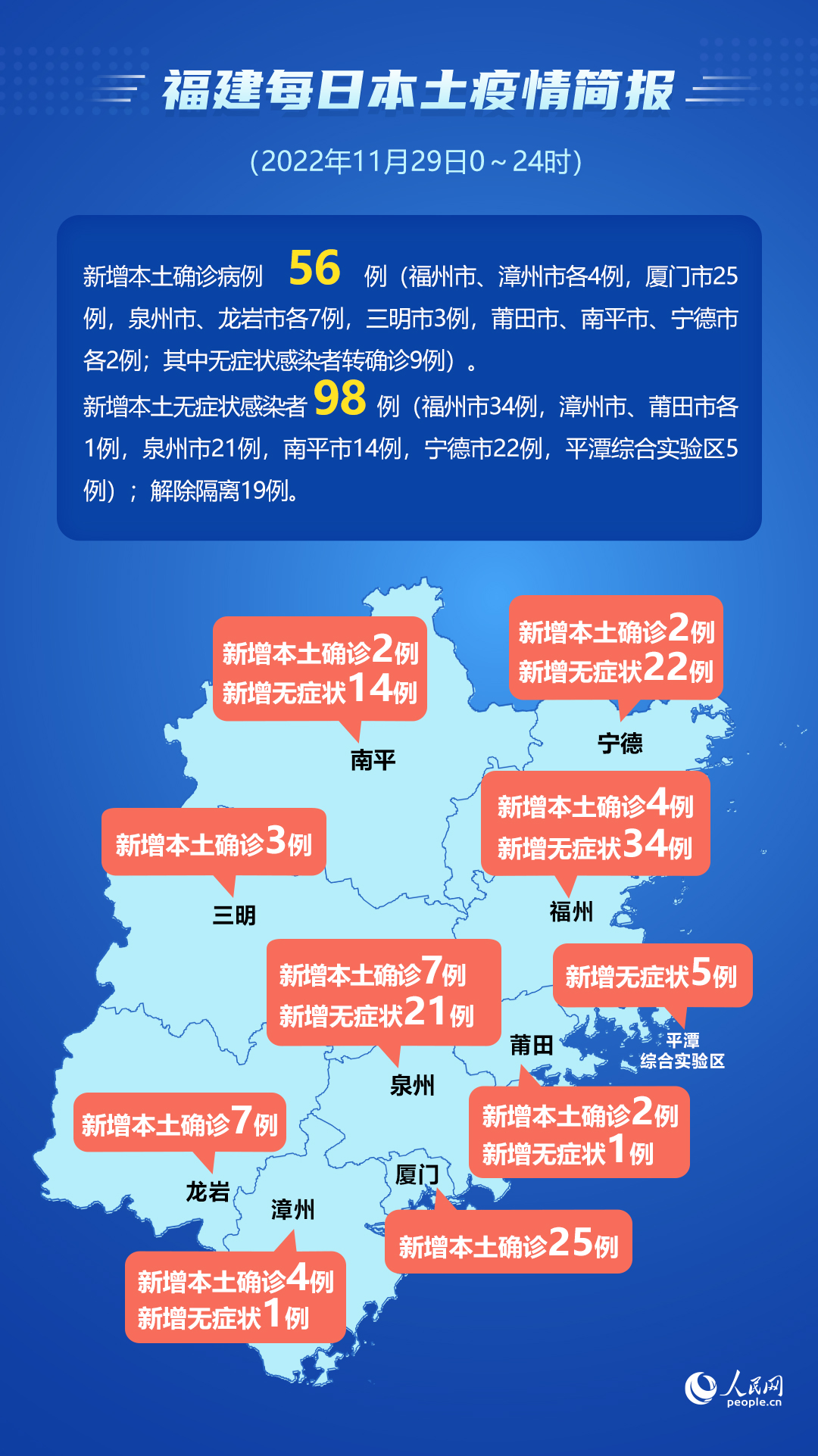 人民网福州11月30日电 (江苇杭、陈永整)据福建省卫健委网站消息,11月29日0-24时,福建省报告新增本土确诊病例新增本土确诊病例56例(福州市、漳州市各4例,厦门市25例,泉州市、龙岩市各7例,三明市3例,莆田市、南平市、宁德市各2例;其中无症状感染者转确诊9例)。当日报告新增本土无症状感染者98例(福州市34例,漳州市、莆田市各1例,泉州市21例,南平市14例,宁德市22例,平潭综合实验区5例);解除隔离19例。全省本土确诊病例目前住院418例,无死亡病例;现有本土无症状感染者尚在接受集中隔离医学观察693例。