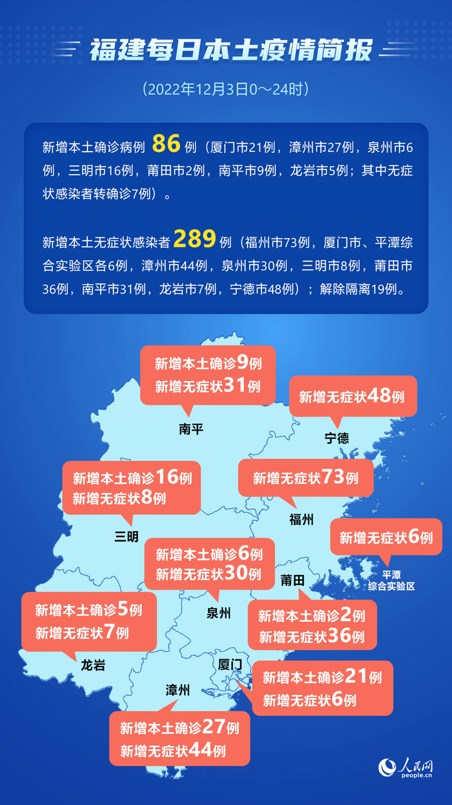 人民网福州12月4日电 (易雪妍、焦艳)据福建省卫健委网站消息,12月3日0~24时,福建省报告新增本土确诊病例86例(厦门市21例,漳州市27例,泉州市6例,三明市16例,莆田市2例,南平市9例,龙岩市5例;其中无症状感染者转确诊7例)。当日报告新增本土无症状感染者289例(福州市73例,厦门市、平潭综合实验区各6例,漳州市44例,泉州市30例,三明市8例,莆田市36例,南平市31例,龙岩市7例,宁德市48例);解除隔离19例。