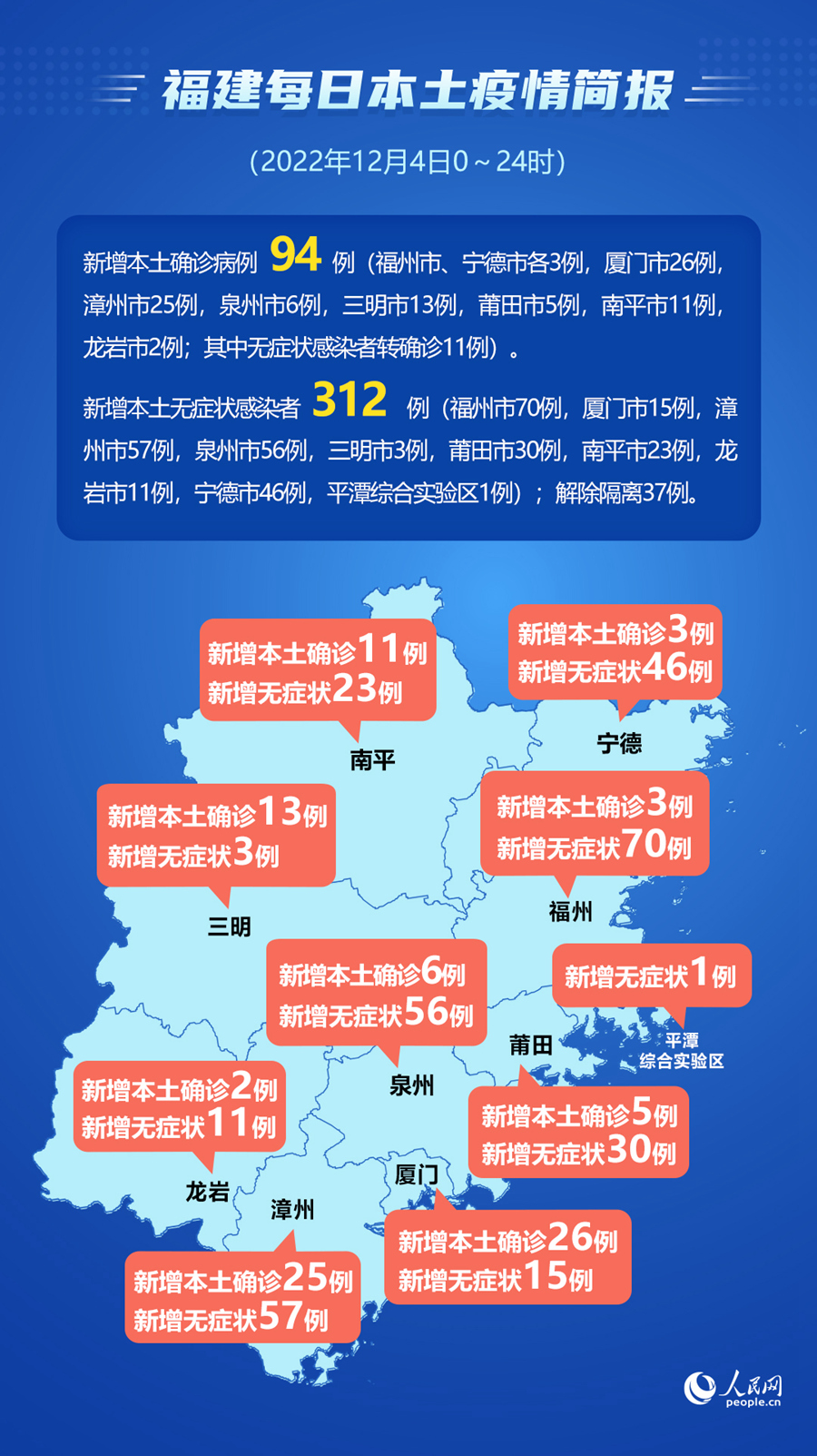人民网福州12月5日电 (易雪妍、陈永整)据福建省卫健委网站消息,12月4日0~24时,福建省报告新增本土确诊病例94例(福州市、宁德市各3例,厦门市26例,漳州市25例,泉州市6例,三明市13例,莆田市5例,南平市11例,龙岩市2例;其中无症状感染者转确诊11例)。当日报告新增本土无症状感染者312例(福州市70例,厦门市15例,漳州市57例,泉州市56例,三明市3例,莆田市30例,南平市23例,龙岩市11例,宁德市46例,平潭综合实验区1例);解除隔离37例。