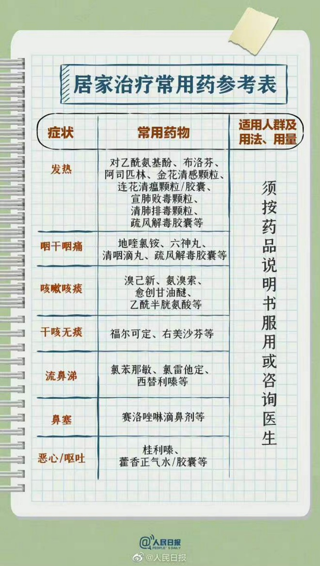 新冠病毒感染者居家治疗常用药参考表。来源:人民日报微博