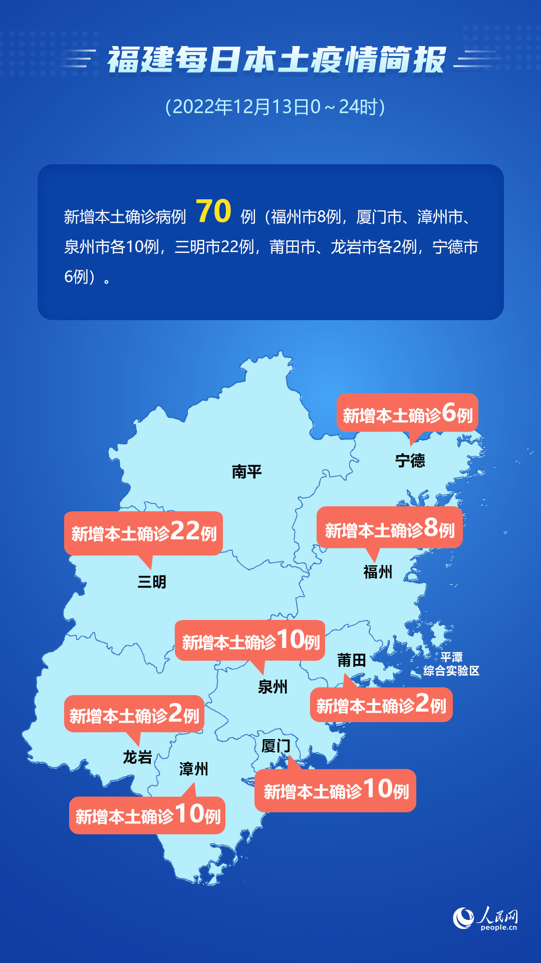 人民网福州12月14日电 (陈楚楚、陈永整)据福建省卫健委网站消息,12月13日0—24时,福建省报告新增本土确诊病例70例(福州市8例,厦门市、漳州市、泉州市各10例,三明市22例,莆田市、龙岩市各2例,宁德市6例)。
