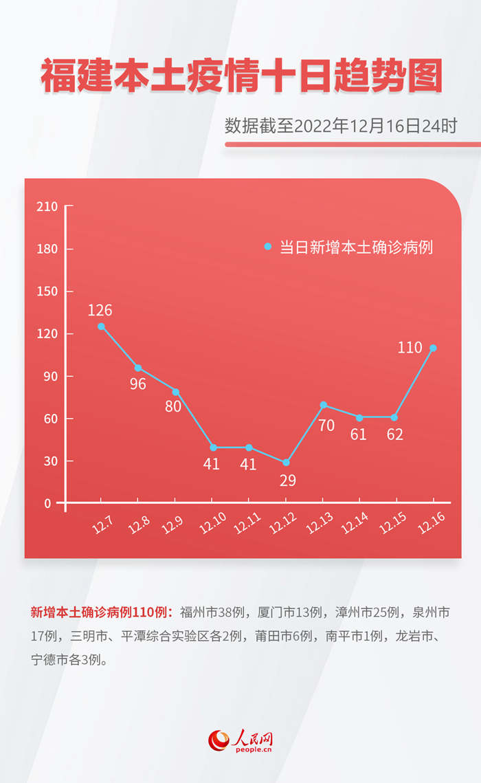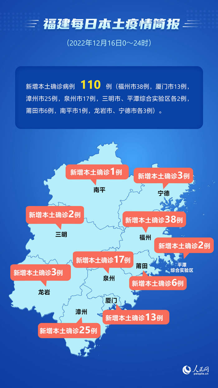 人民网福州12月17日电 (易雪妍、焦艳)据福建省卫健委网站消息,12月16日0~24时,福建省报告新增本土确诊病例110例(福州市38例,厦门市13例,漳州市25例,泉州市17例,三明市、平潭综合实验区各2例,莆田市6例,南平市1例,龙岩市、宁德市各3例)。