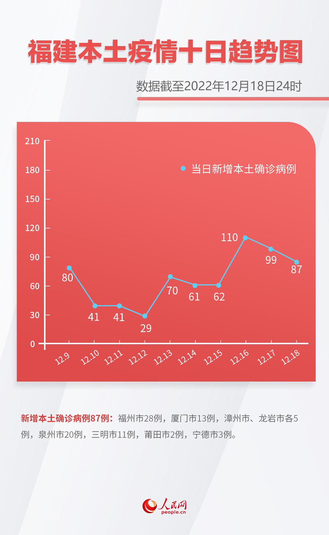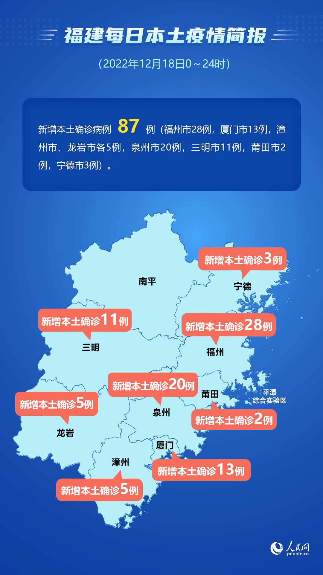 人民网福州12月19日电 (江苇杭、陈永整)据福建省卫健委网站消息,12月18日0-24时,福建省报告新增本土确诊病例87例(福州市28例,厦门市13例,漳州市、龙岩市各5例,泉州市20例,三明市11例,莆田市2例,宁德市3例)。目前,全省本土确诊病例住院563例,无死亡病例。