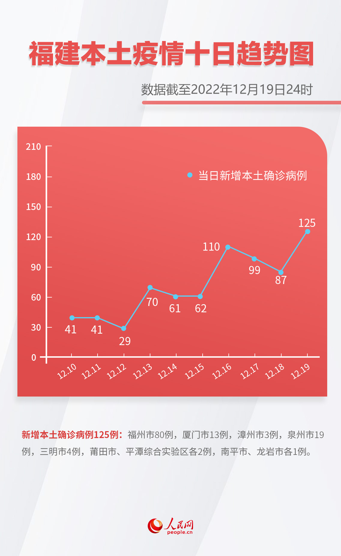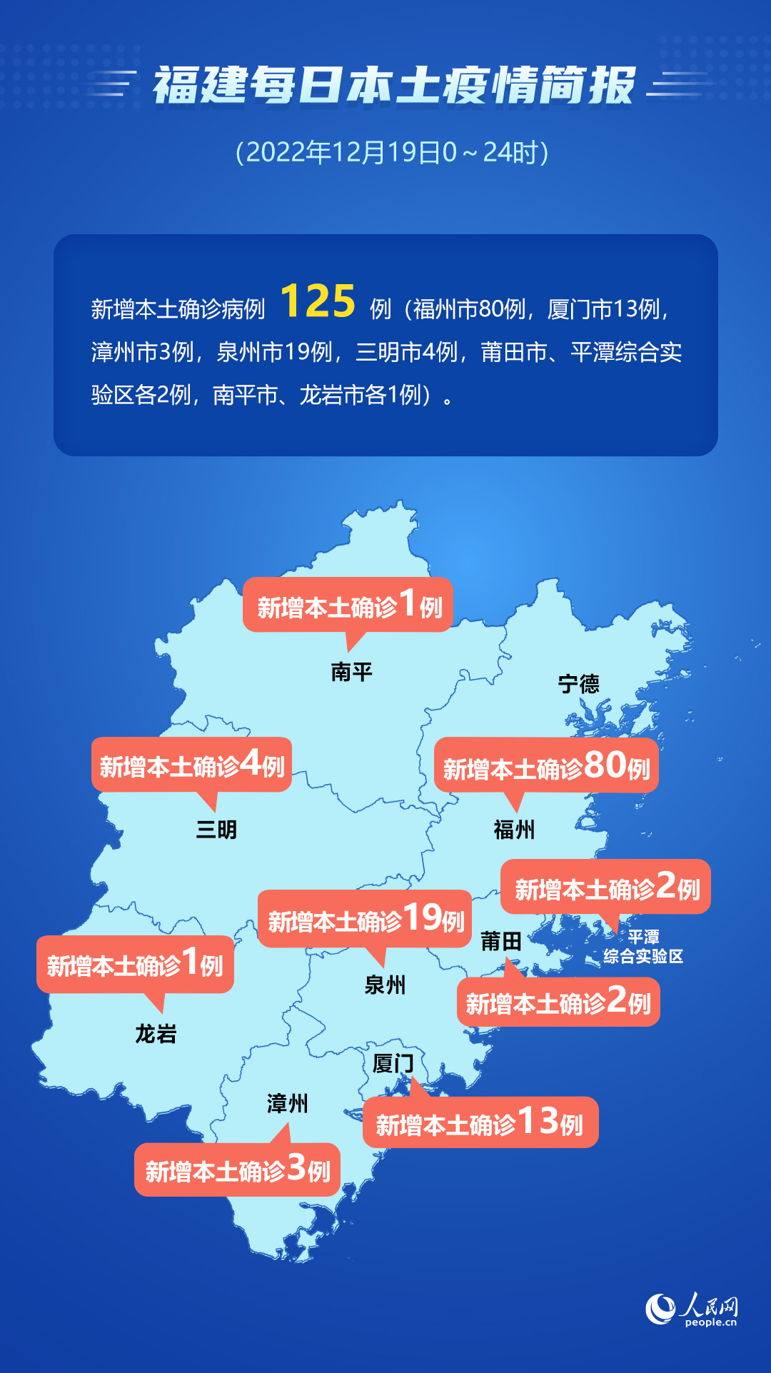 人民网福州12月20日电 (江苇杭、陈永整)据福建省卫健委网站消息,12月19日0-24时,福建省报告新增本土确诊病例125例(福州市80例,厦门市13例,漳州市3例,泉州市19例,三明市4例,莆田市、平潭综合实验区各2例,南平市、龙岩市各1例)。目前,全省本土确诊病例住院626例,无死亡病例。